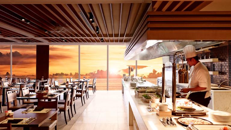 라세느 뷔페의 양식 코너에서는 스테이크, 양고기, 파스타, 리조또 등 다양한 서양 요리를 맛볼 수 있습니다. 그릴 코너에서는 고기와 채소를 즉석에서 구워내어 그 풍미를 그대로 즐길 수 있습니다.
