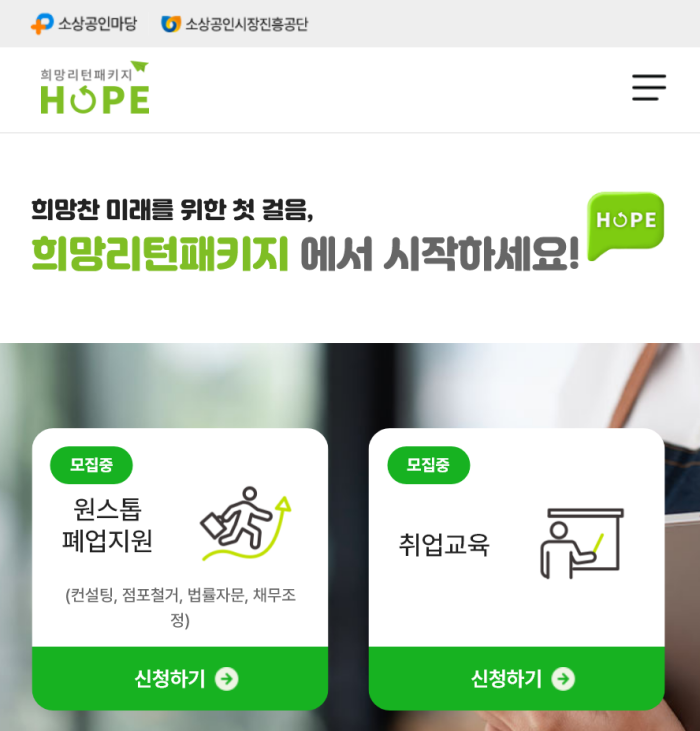 - 희망리턴패키지 홈페이지 (http://hope.sbiz.or.kr) 방문