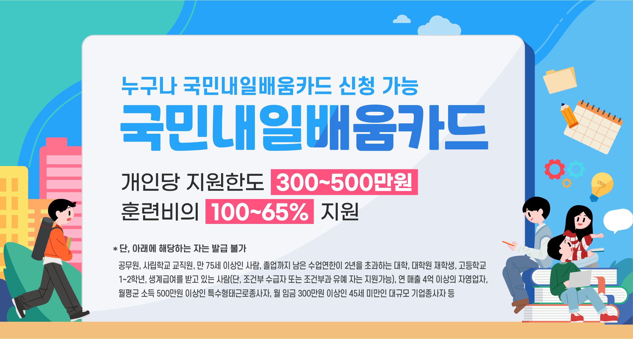 국민 내일배움카드는 대부분의 국민이 신청할 수 있지만, 일부 제외 대상이 있습니다. 제외 대상에는 현직 공무원, 사립학교 교직원, 만 75세 이상, 연 매출 1억 5천만 원 이상의 자영업자가 포함됩니다. 이 외의 국민들은 누구나 신청이 가능하며, 다양한 교육 기회를 누릴 수 있습니다. 특히, 실업자, 비정규직, 자영업자 등을 포함한 다양한 사람이 이 프로그램을 통해 혜택을 받을 수 있습니다.