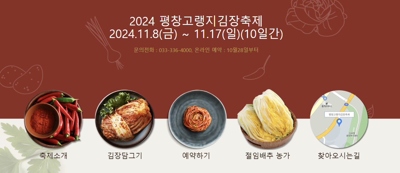 평창 고랭지김장축제는 단순한 축제가 아닙니다. 우리의 전통을 배우고, 가족과 함께 특별한 추억을 만들며, 평창의 아름다운 자연을 즐길 수 있는 완벽한 가을 여행지입니다. 올해 가을, 평창 고랭지김장축제와 함께 특별한 추억을 만들어보세요!