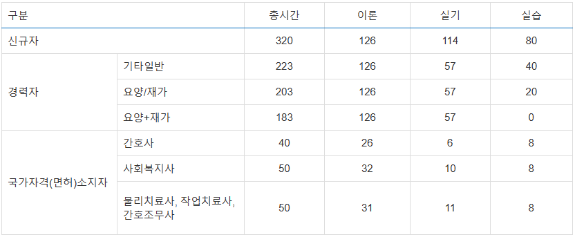 요양보호사 자격증 취득을 위한 교육과정은 총 320시간으로 구성되어 있습니다: