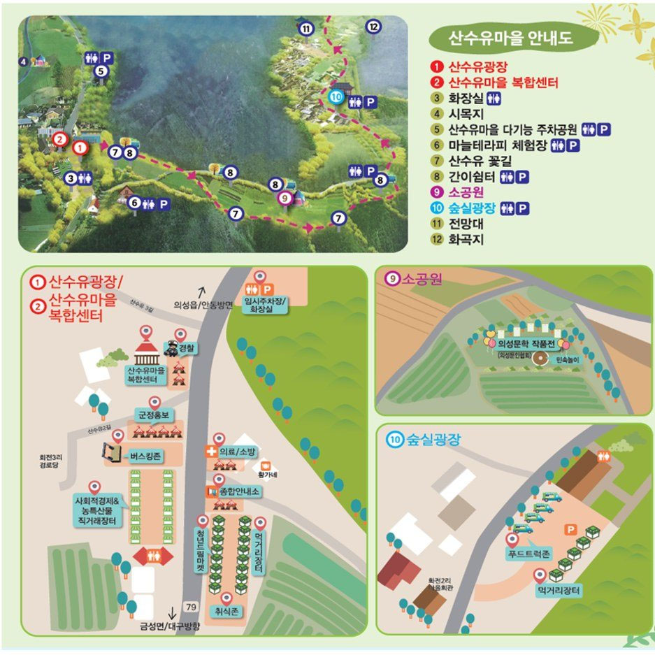 자가용 이용 시 네비게이션에 "의성 산수유마을" 또는 "경상북도 의성군 사곡면 산수유2길 2"를 검색하세요. 축제 기간 동안 임시주차장이 운영되며, 셔틀버스도 운행됩니다.